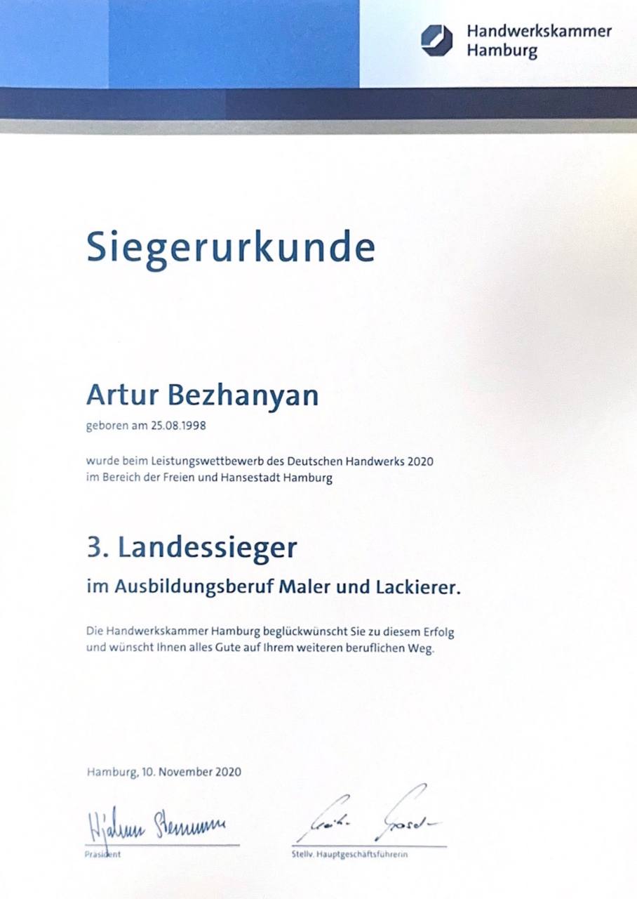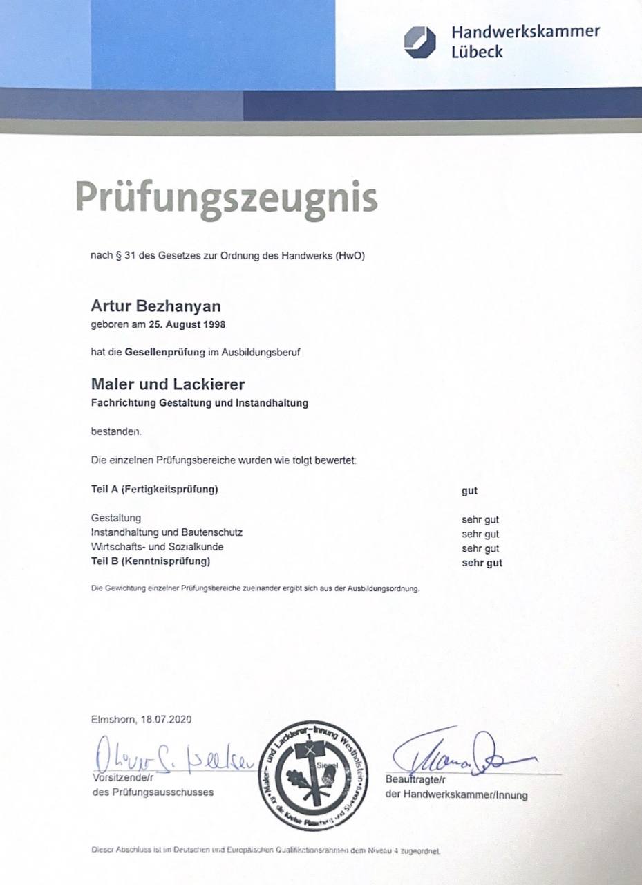 Willkommen auf der Seite von Art & Paints Malereibetrieb. Mein Name ist Artur Bezhanyan, ich bin 25 Jahre alt, komme aus Armenien und lebe seit 2014 in Deutschland. Nach verschiedenen beruflichen Erfahrungen fand ich 2016 durch ein Praktikum meine Leidenschaft für das Maler und Lackiererhandwerk. Diese Erfahrung begeisterte mich so sehr, dass ich beschloss, meine berufliche Zukunft in diesem Bereich zu gestalten.