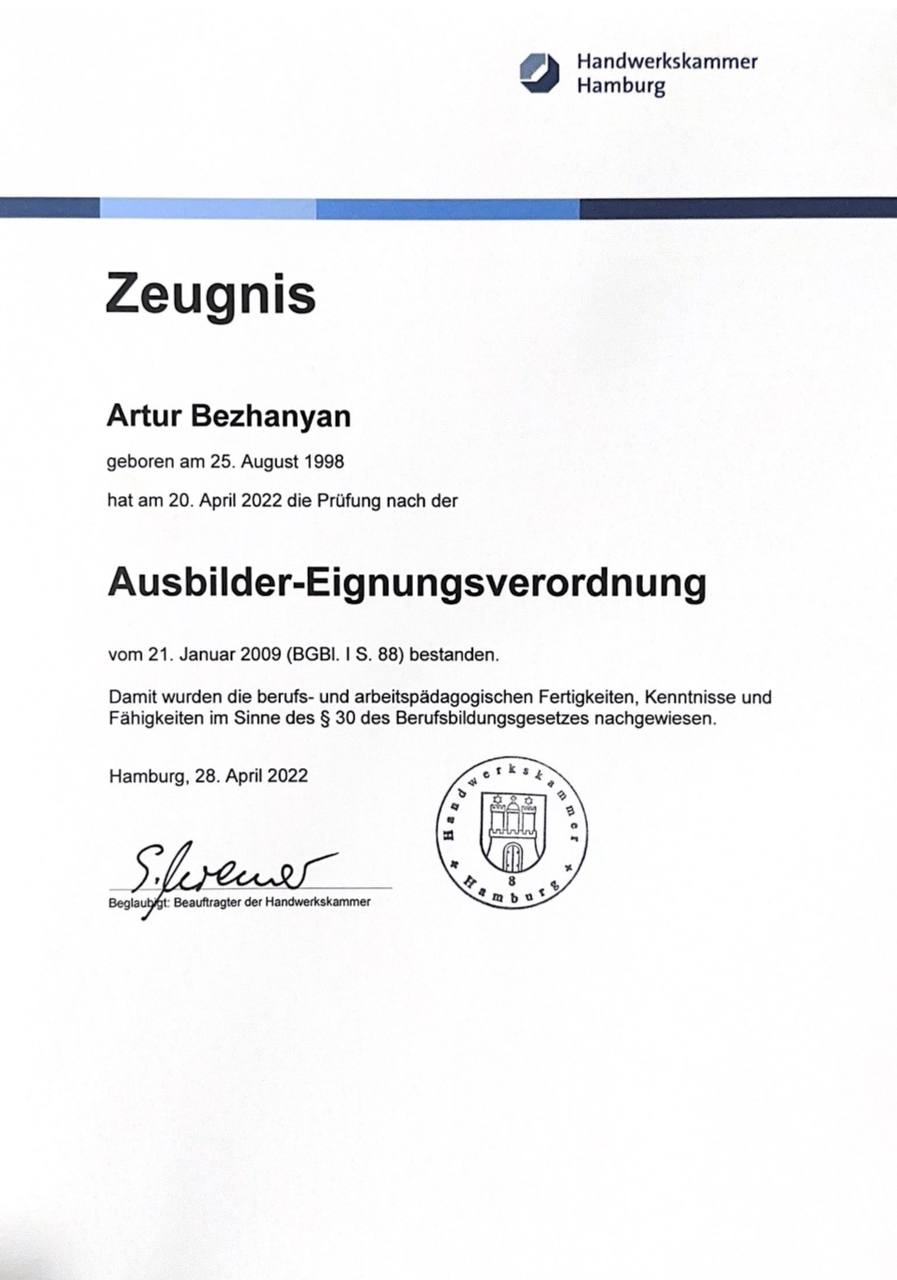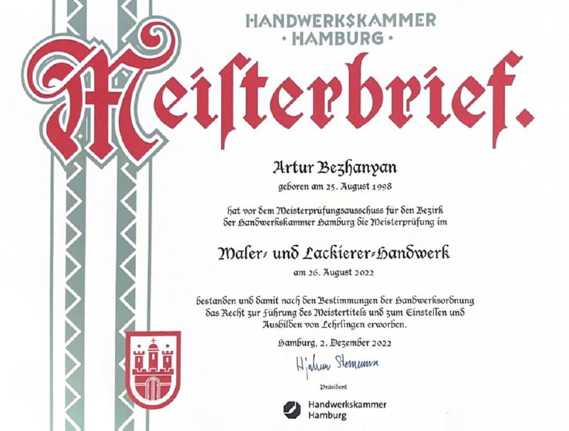 2017 begann ich meine Ausbildung zum Maler und Lackierer, die ich 2020 als Kreissieger erfolgreich abschloss. Im selben Jahr erzielte ich den dritten Platz beim Leistungswettbewerb der Handwerkskammer Hamburg. Nach einem Jahr Berufspraxis als Geselle entschied ich mich, meine Qualifikationen weiter auszubauen und begann 2021 eine Vollzeitausbildung an der Meisterschule G6 Holz, Farbe, Textil. Diese schloss ich 2022 erfolgreich mit dem Meistertitel ab. Im Anschluss daran war ich ein Jahr lang als angestellter Meister tätig. Seit dem 1. Juli 2023 bin ich als selbstständiger Unternehmer im Maler und Lackiererhandwerk tätig und führe erfolgreich mein eigenes Unternehmen.